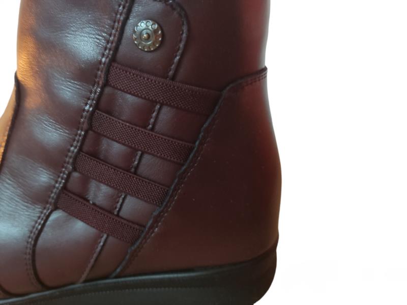 Botín de piel blandita y suela de goma muy flexible. Lleva cremallera en la parte interior para facilitar su puesta.  Adorno de elásticos a tono en el lado