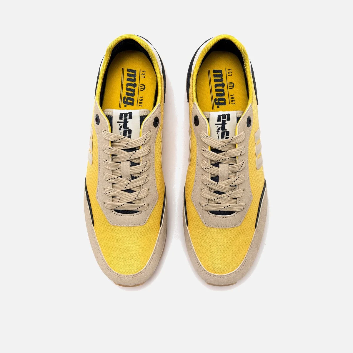 Zapatillas de color amarillo con detalles beige y negro para hombre de la marca Mustang, modelo Joggo, con inspiración retro running. Su diseño combina paneles en contraste y una suela con franja roja que aporta un estilo dinámico y juvenil. Incorpora logotipo lateral en relieve, talonera con inscripción '1967' y ojales metálicos que refuerzan su carácter deportivo. Equipadas con plantillas con tecnología Starfit, que mejoran la comodidad en cada paso. Con certificado VEGANO sellado por INESCOP, el cual garantiza que la naturaleza química principal del material no se corresponde con fibras de origen animal.
