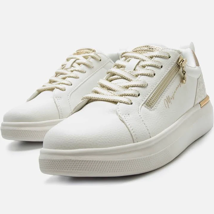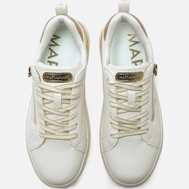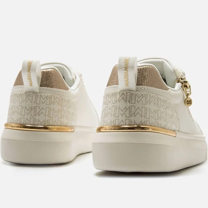 Zapatillas casual de color blanco para mujer, modelo Varese de Mariamare con un estilo urbano y detalles metalizados. El talón incorpora el logotipo en tono dorado, a juego con la cremallera lateral funcional y los cordones con borde brillante. La suela blanca aporta altura y equilibrio al diseño, manteniendo un perfil limpio y actual. Equipadas con plantillas con tecnología Starfit, que mejoran la comodidad en cada paso. Con certificado VEGANO sellado por INESCOP, el cual garantiza que la naturaleza química principal del material no se corresponde con fibras de origen animal.