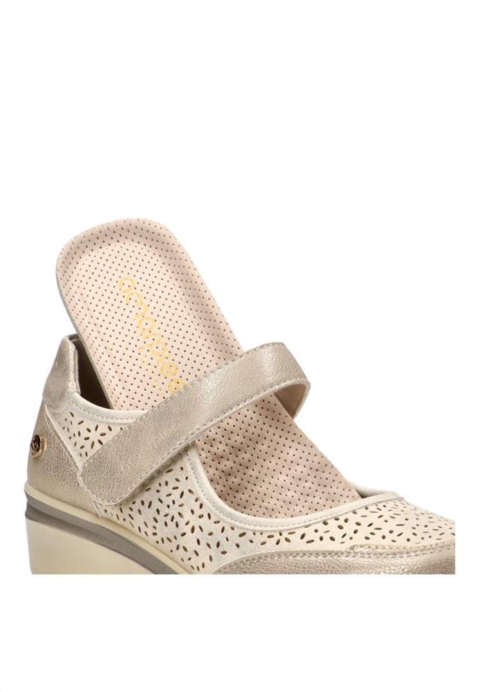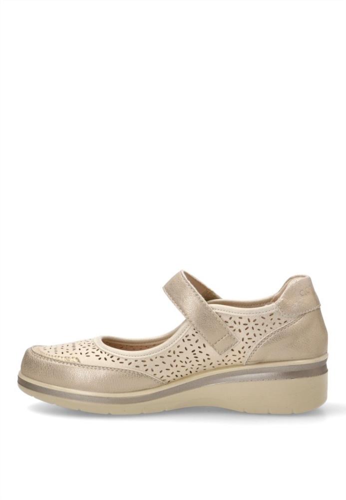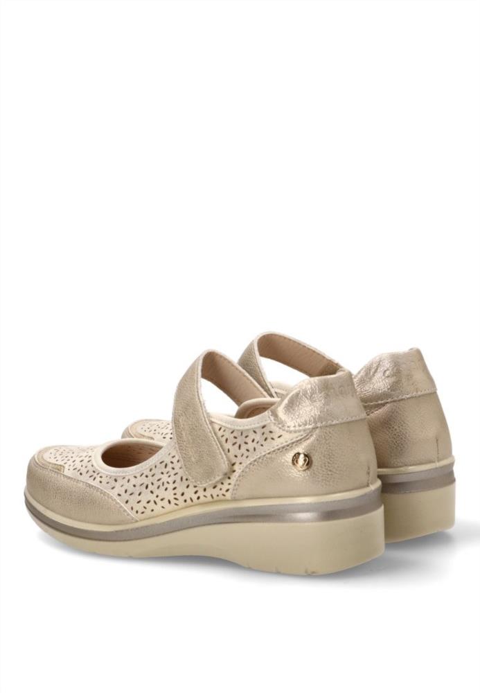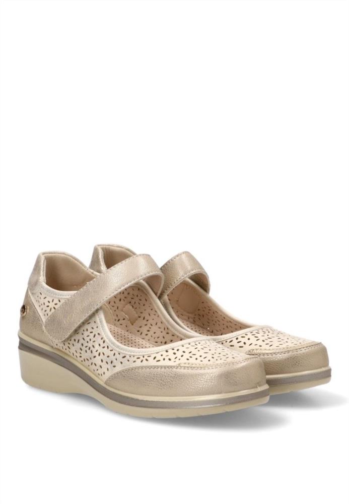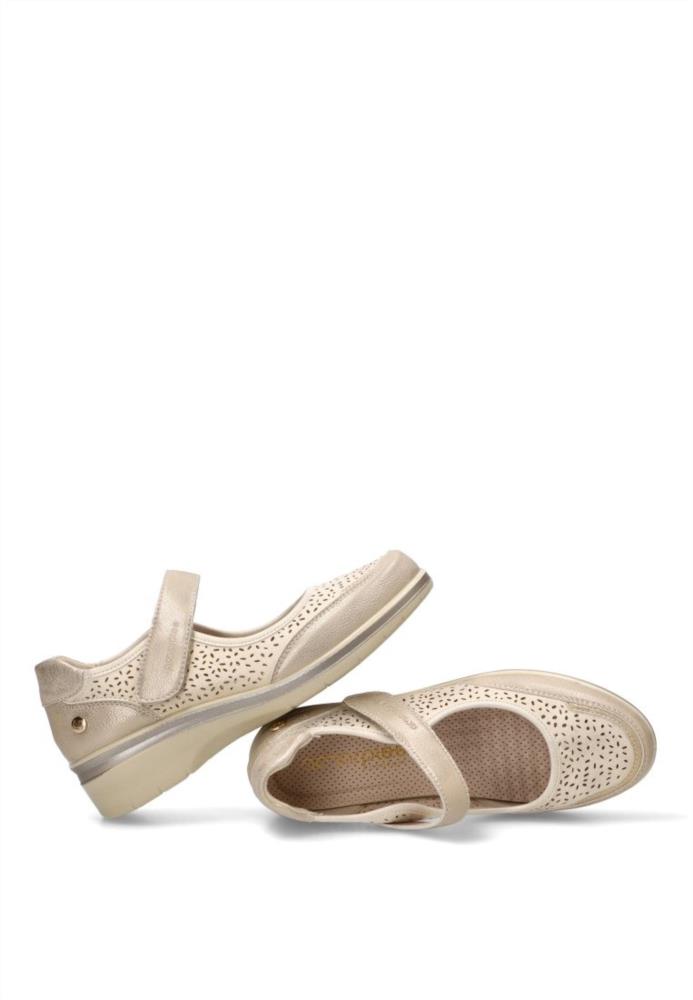 Zapato mercedita de mujer, estilo casual. Modelo cómodo, fabricado en piel sintética suave y picada. Suela de goma ligera y flexible. Plantilla acolchada y extraíble. Color platino. Merceditas elegante que te dará el máximo confort en tu día a día.